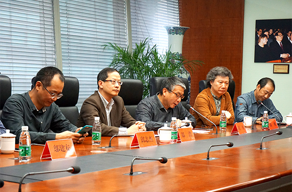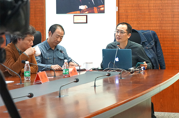 (左一:本屆雙年展中國館策展人邱志杰、左二:文化部外聯(lián)局局長助理鄭浩、右二:中國美術(shù)家協(xié)會《美術(shù)》雜志社社長兼主編尚輝)