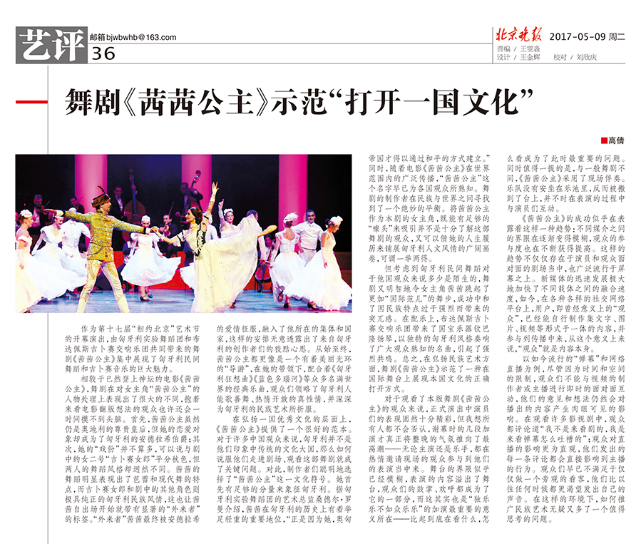 作為第十七屆“相約北京”藝術(shù)節(jié)的開幕演出,由匈牙利實(shí)驗(yàn)舞蹈團(tuán)和布達(dá)佩斯吉卜賽交響樂團(tuán)共同帶來的舞劇《茜茜公主》集中展現(xiàn)了匈牙利民間舞蹈和吉卜賽音樂的巨大魅力。