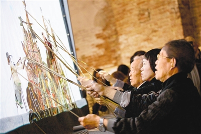 皮影和現(xiàn)代的電影、電視有相近的影視效果,卻有著千年的歷史。中國工藝美術(shù)大師、“非遺”項(xiàng)目陜西皮影傳承人汪天穩(wěn)與湯南南、鄔建安共同創(chuàng)作的皮影“不息——移山填?!痹谡箯d的3個(gè)屏幕演出。他們希望“使用傳統(tǒng)皮影的工藝去創(chuàng)作全新的當(dāng)代藝術(shù)作品?!庇眠@種溝通古今的形式來表現(xiàn)愚公移山、精衛(wèi)填海、夸父追日、大禹治水等中華民族生生不息神話傳說,揭示藝術(shù)內(nèi)在的民族精神力量。