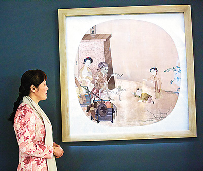 中國刺繡有著比紙上繪畫更悠久的傳統(tǒng),參展藝術(shù)家、國家級“非遺”傳承人姚慧芬用上百種不同的針法來再創(chuàng)作李嵩《骷髏幻戲圖》、馬遠(yuǎn)《十二水圖》這兩幅宋代古畫。當(dāng)皮影、刺繡和實(shí)時(shí)錄像、動畫、自動機(jī)械表的表演配合展示時(shí),給人一種時(shí)空交錯(cuò)的感覺。