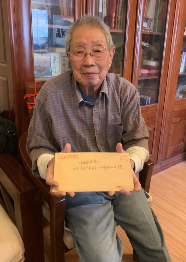 在走訪慰問過程中,黃曉華與葉瑞福親切交談,感謝他幾十年來為集團公司文化宣傳事業(yè)做出的貢獻,同時感謝他在2020年向集團捐贈一批多年珍藏的歷史資料。今年89歲的葉瑞福是傷殘退伍軍人,是集團原中演公司宣傳、資料管理方面負責人,承擔演出項目的宣傳及藝術檔案等工作。慰問過程中,葉瑞福同志拿出早已準備好的兩個信封交給隨黃書記一同前往的工作人員,一個信封里裝有他本人2021年黨費,另一個信封裝有為慶祝中國共產(chǎn)黨成立100周年繳納的特殊黨費1000元,以表達對黨的感激之情,向黨獻禮。