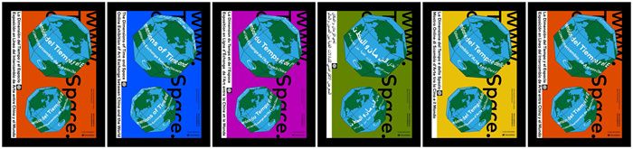 六種語言展覽海報,依次為中文版、英文版、法文版、阿拉伯文版、意大利文版、西班牙文版